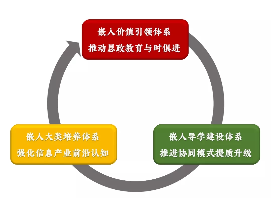 既注重與企業(yè)協(xié)同開展引導(dǎo)學(xué)生樹立遠(yuǎn)大理想、立大志入主流的思政育人,也注重與企業(yè)開設(shè)信息產(chǎn)業(yè)前沿認(rèn)知與創(chuàng)新創(chuàng)業(yè)能力實(shí)訓(xùn)課程,開展大通識(shí)教育、專業(yè)通識(shí)教育,提升大類培養(yǎng)成效。