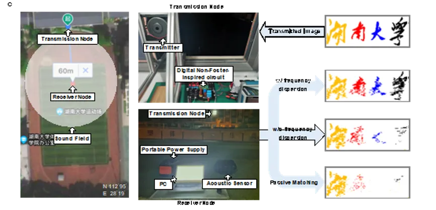 實(shí)驗(yàn)證明所提出的數(shù)字非福斯特電路能夠在遠(yuǎn)距離圖像傳輸?shù)倪^程中提供穩(wěn)定的,具有頻散效應(yīng)的實(shí)時等效負(fù)阻抗特性,并且與模擬非福斯特匹配網(wǎng)絡(luò)對比,將電聲發(fā)射裝置的工作帶寬提高了五倍以上,功率處理能力提高了三個數(shù)量級以上。其原理和方法可被廣泛應(yīng)用于各類亞波長共振系統(tǒng)裝備,包括電聲發(fā)射,電磁天線,寬帶超材料等,具有重要的工程應(yīng)用價值。