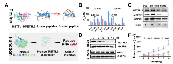 甲基腺嘌呤修飾與多種腫瘤的發(fā)生發(fā)展密切相關(guān)。作為參與修飾最重要的甲基轉(zhuǎn)移酶—METTL3,已成為治療癌癥等疾病的潛在治療靶標(biāo),受到學(xué)界和業(yè)界的密切關(guān)注。該研究基于METTL3-METTL14蛋白結(jié)構(gòu),設(shè)計了靶向METTL3的多肽抑制劑RM3。進(jìn)一步優(yōu)化獲得更高活性的訂書肽抑制劑RSM3,該多肽具有廣譜的抑癌特性,能夠殺傷多種METTL3高表達(dá)的腫瘤細(xì)胞。同時在多種腫瘤模型中,RSM3顯示出優(yōu)異的抗腫瘤效果。