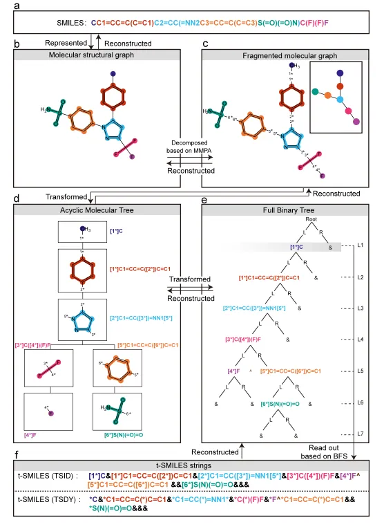 近日,湖南大學(xué)化學(xué)化工學(xué)院俞汝勤院士團(tuán)隊在分子表征的研究中取得新進(jìn)展。該研究介紹了一種可擴(kuò)展的、基于片段的多尺度分子表示框架,稱為 t-SMILES(基于樹的 SMILES),包括三種編碼算法:TSSA、TSDY和TSID。t-SMILES系統(tǒng)僅引入了兩個不需要配對的新符號,給1988年發(fā)表的最經(jīng)典分子線性表示法SMILES引入了片段結(jié)構(gòu)信息,同時縮短了SMILES描述符中由于需要配對的括號和數(shù)字所帶來的長期依賴問題,并因其語法的簡單性使得t-SMILES非常易于學(xué)習(xí)。該研究關(guān)注自然語言處理模型協(xié)助化學(xué)家進(jìn)行分子空間探索時面臨的最核心也是最基礎(chǔ)的如何編碼分子的問題,為AI輔助的分子建模提供了新的研究思路,助力分子“智造”。相關(guān)研究成果發(fā)表在Nature Communications上。