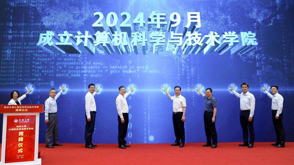 同濟大學(xué)黨委書記方守恩,校長、中國工程院院士鄭慶華,上海市教衛(wèi)工作黨委副書記、上海市教育委員會副主任顧紅亮,上海市科學(xué)技術(shù)委員會副局長級干部謝文瀾,上海市經(jīng)濟和信息化委員會二級巡視員劉益平,上海市嘉定區(qū)副區(qū)長魏曉棟,以及同濟大學(xué)計算機科學(xué)與技術(shù)學(xué)院黨委書記熊嵐、院長申恒濤共同揭牌。