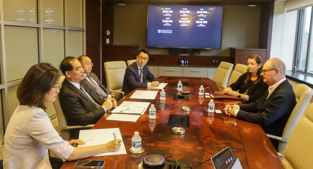 訪問芝加哥大學(xué)期間,芝加哥大學(xué)校長保羅·阿利維薩托斯(Paul Alivisatos)會(huì)見代表團(tuán)一行。龔旗煌感謝芝加哥大學(xué)對(duì)2024年中美頂尖大學(xué)“10+10”校長論壇給予的鼎力支持,并回顧了兩校在教學(xué)科研、人才培養(yǎng)等領(lǐng)域的密切合作。龔旗煌表示,芝加哥大學(xué)北京中心及北京大學(xué)芝加哥中心在促進(jìn)兩校深度合作方面具有標(biāo)志性意義,希望未來兩校在學(xué)生聯(lián)合培養(yǎng)、科學(xué)研究等領(lǐng)域開展更加廣泛的合作。阿利維薩托斯歡迎龔旗煌一行訪問芝加哥大學(xué),并介紹了芝加哥大學(xué)海外中心在人才培養(yǎng)領(lǐng)域發(fā)揮的重要作用。他希望在已有合作基礎(chǔ)上,進(jìn)一步深化兩校合作。