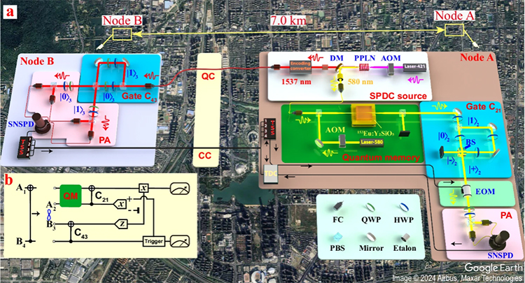 在該工作中,研究團隊基于量子門隱形傳送協(xié)議來建立兩個量子節(jié)點之間的非局域量子門。兩個量子節(jié)點之間的直線距離為7公里,分別位于中國科學(xué)技術(shù)大學(xué)東校區(qū)(簡稱中國科大)和合肥市大蜀山東側(cè)(簡稱大蜀山)。研究團隊首先在兩節(jié)點間使用通信波段光子和專線光纜進行了量子糾纏態(tài)的遠程分發(fā)。隨后,中國科大節(jié)點和大蜀山節(jié)點分別執(zhí)行本地的兩比特量子門操作。中國科大節(jié)點采用摻銪硅酸釔晶體實現(xiàn)糾纏光子的存儲,直到接收到大蜀山節(jié)點的測量結(jié)果,并根據(jù)這一結(jié)果執(zhí)行相應(yīng)的單比特門操作。