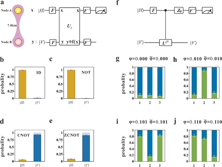 實驗結(jié)果表明,固態(tài)量子存儲器的糾纏存儲時間達到80.3μs,相比前人工作提升近2倍,并且糾纏存儲的時間模式數(shù)達1097個,使得非局域量子門的生成速率獲得了線性的提升?;诜蔷钟蛄孔娱T,研究團隊進一步操控,實現(xiàn)了量子算法的遠程分布式執(zhí)行。