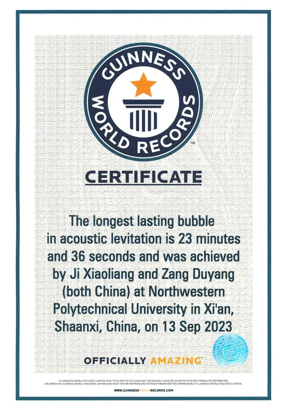 以此成果為指引,臧渡洋教授課題組制備出了“地面上最長(zhǎng)壽命氣泡”并創(chuàng)下吉尼斯世界紀(jì)錄:在聲懸浮條件下,氣泡保持時(shí)間達(dá)到23分36秒。