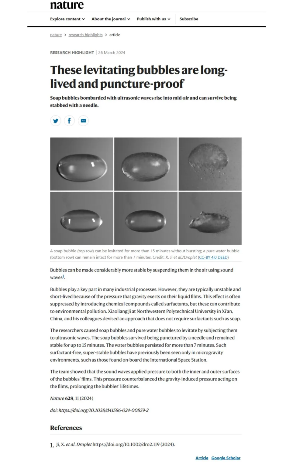 該研究成果以“Extraordinary stability of surfactant-free bubbles suspended in ultrasound”為題發(fā)表在國(guó)際知名學(xué)術(shù)期刊Droplet上(期刊封面故事),并被Nature期刊亮點(diǎn)報(bào)道。