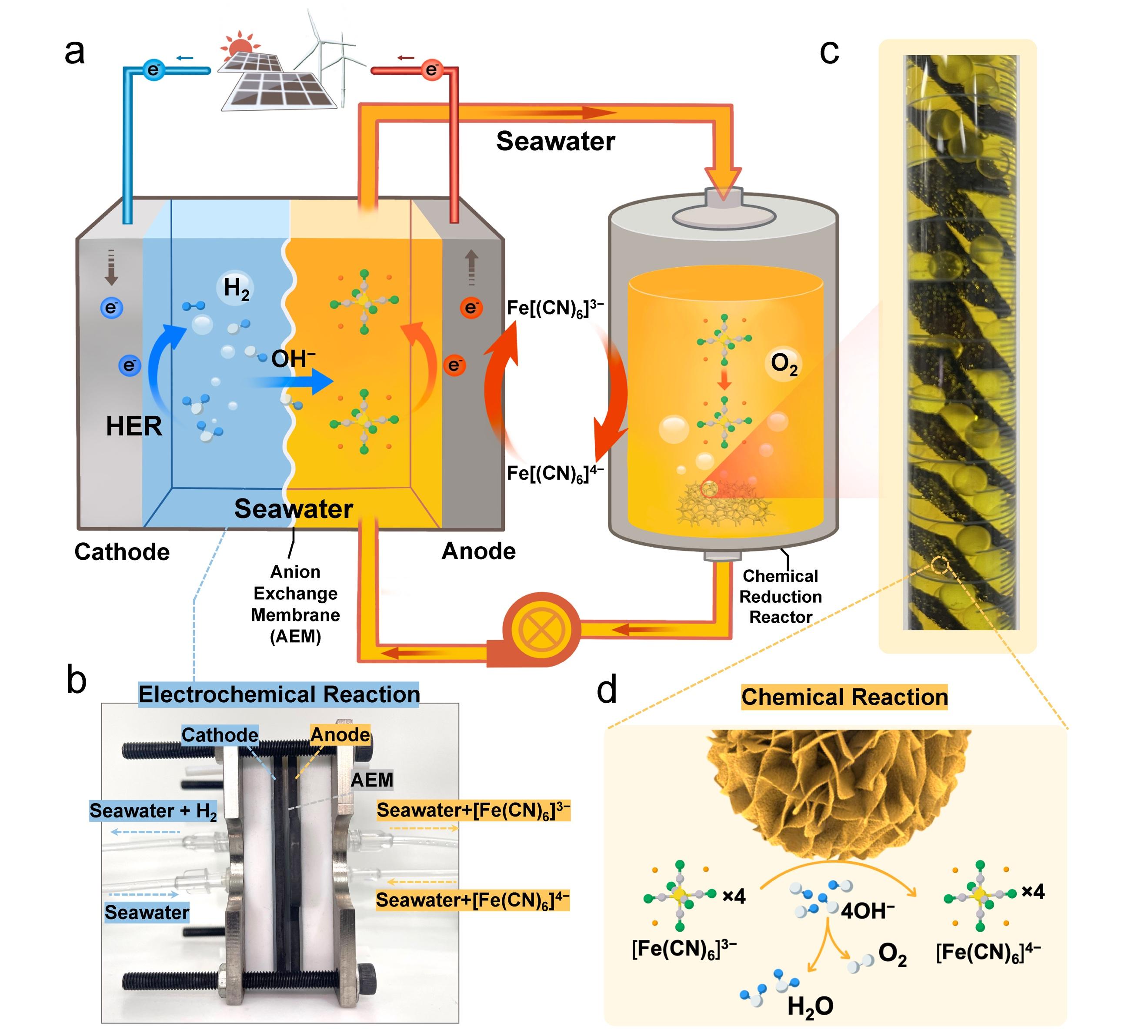 不同于2022年11月謝和平院士團隊Nature正刊上提出的相變遷移海水直接電解制氫顛覆性原理技術,該研究是謝和平院士團隊圍繞海水中的氯離子引發(fā)副反應和電極腐蝕現(xiàn)象,提出的另一種新的解耦式海水直接電解制氫策略。論文系統(tǒng)研究了鐵氰酸根/亞鐵氰酸根電對([Fe(CN)6]3?/4?)在真實海水體系下可逆氧化還原特性,探明了電解系統(tǒng)陰極析氫反應與陽極亞鐵氰酸根氧化反應的高效性,厘清了解耦體系下氧氣自發(fā)穩(wěn)定產(chǎn)出的反應機理,實現(xiàn)了全新系統(tǒng)在真實海水環(huán)境下250小時的長時間穩(wěn)定。該項原理技術巧妙規(guī)避了海水中氯離子對電解制氫反應的干擾,充分驗證了解耦式海水直接電解制氫系統(tǒng)在復雜海水環(huán)境下的抗腐蝕性與對氯離子副反應的應用潛力,將有助于豐富和進一步構(gòu)建破解海水復雜成分影響的海水電解制氫理論體系和技術框架。