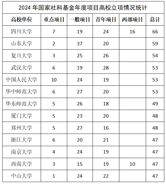 近日,全國哲學(xué)社會科學(xué)工作辦公室正式公布了2024年度國家社科基金年度項目立項情況,四川大學(xué)以總數(shù)66項居于全國高校第一位,其中重點項目7項居于全國高校第二。