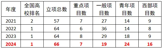 據(jù)統(tǒng)計,自國家“十四五”規(guī)劃以來,我校國家社科基金年度項目立項總數(shù)251項,總數(shù)保持了全國高校第一位,其中2021年居于全國高校第二,2022年—2024年居于全國高校第一。