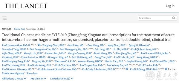 在這項題為“Traditional Chinese medicine FYTF-919 (Zhongfeng Xingnao oral prescription) for the treatment of acute intracerebral haemorrhage: a multicentre, randomised, placebo-controlled, double-blind, clinical trial”(《中醫(yī)藥FYTF919治療急性腦出血:一項多中心隨機、安慰劑對照的雙盲臨床研究》)的研究中,研究人員發(fā)現,“中風醒腦方”在整體上未對急性腦出血患者的臨床預后產生顯著改善,但在特定群體——皮層出血和中等以上出血患者中,顯示出潛在效果(有待進一步驗證)。