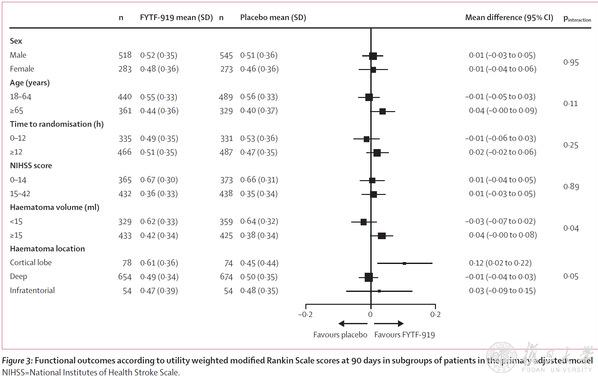 研究結果顯示,試驗組和安慰劑組在90天UW-mRS的平均值上所差無幾,各項敏感性分析結果均一致,在亞組分析上,治療效果在血腫體積和血腫位置方面展現出了顯著異質性。