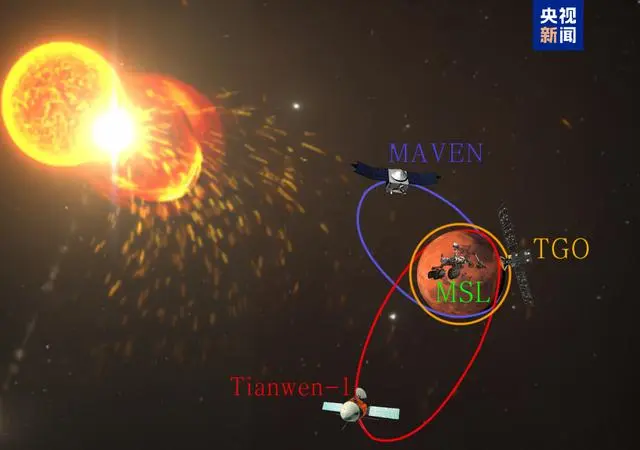 △圖示:2022年2月15日太陽高能粒子事件同時(shí)被中國的天問一號軌道器(Tianwen-1)、歐州航天局的微量氣體軌道飛行器(TGO)、美國航空航天局的火星大氣和揮發(fā)性演化軌道器(MAVEN)以及火星表面的好奇號火星車(MSL)探測到。