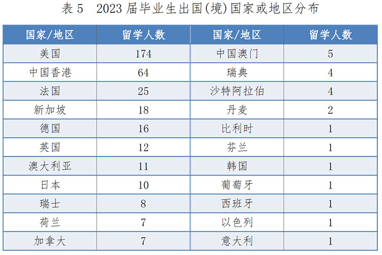 出國(境)留學(xué)374人,其中本科生出國(境)留學(xué)248人,占本科畢業(yè)生總?cè)藬?shù)的13.9%;研究生出國(境)留學(xué)126人,占畢業(yè)研究生總?cè)藬?shù)的2.4%。出國(境)留學(xué)的本科畢業(yè)生中75%以上獲國外獎學(xué)金資助。留學(xué)去向分布于全球 22 個國家或地區(qū),其中,赴美國留學(xué)人數(shù)最多,占出國(境)總?cè)藬?shù)的 46.5%,其次為中國香港(17.1%)、法國(6.7%)、新加坡(4.8%)等。