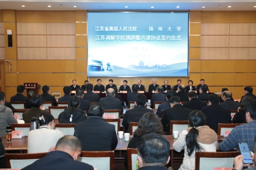 12月9日下午,揚州大學舉行江蘇調(diào)解學院揭牌暨共建協(xié)議簽約儀式?;顒蝇F(xiàn)場,江蘇省高級人民法院黨組書記、院長夏道虎,揚州大學黨委書記焦新安共同為“江蘇調(diào)解學院”揭牌。江蘇省高院與揚州大學共同簽訂《共建江蘇調(diào)解學院合作框架協(xié)議》,揚州中院與揚州大學共同簽訂《全面合作協(xié)議》。