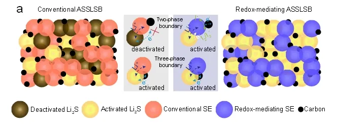 圖1. 傳統(tǒng)全固態(tài)鋰硫電池的問(wèn)題及本研究的快速固固硫轉(zhuǎn)化反應(yīng)機(jī)制。
