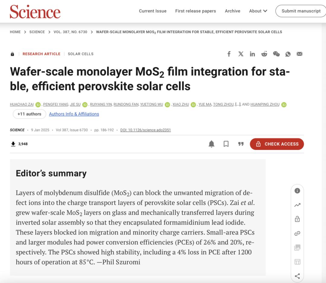 1月9日,北京大學周歡萍教授、張艷鋒教授(共同通訊作者)在Science上發(fā)表了題為“Wafer-scale monolayer MoS2 film integration for stable, efficient perovskite solar cells”(晶圓級單層MoS2薄膜集成實現(xiàn)穩(wěn)定、高效的鈣鈦礦太陽能電池)的研究論文。