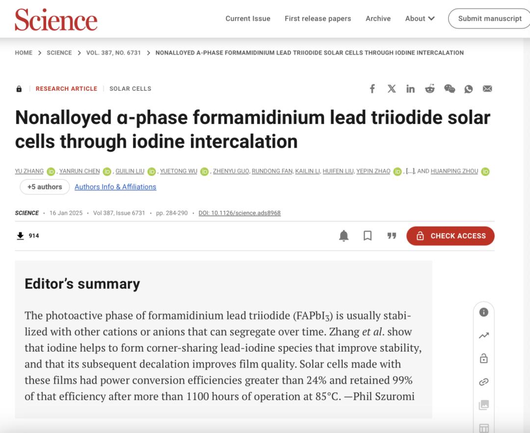1月16日,周歡萍教授為獨立通訊作者,再度在Science發(fā)表了題為“Nonalloyed α-phase formamidinium lead triiodide solar cells through iodine intercalation”(通過碘嵌入制備非合金α-FAPbI3太陽能電池)的研究論文。這是Science期刊在一周之內(nèi)連續(xù)兩次刊發(fā)周歡萍團隊在鈣鈦礦太陽能電池領(lǐng)域的研究進展。