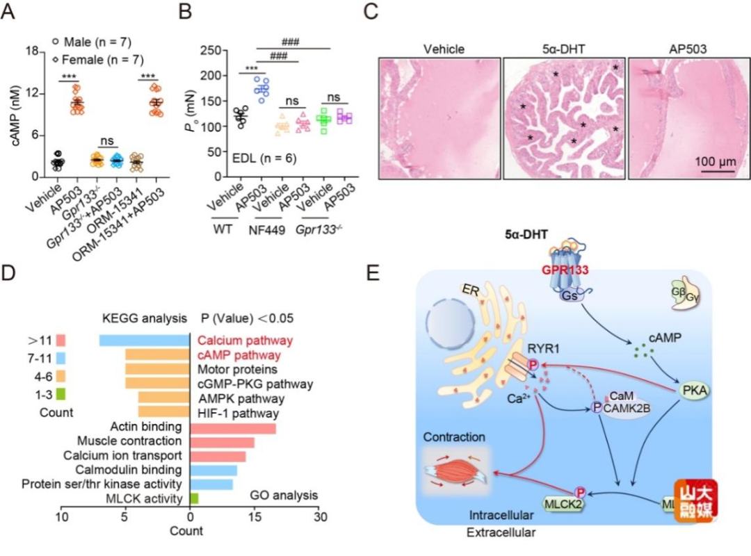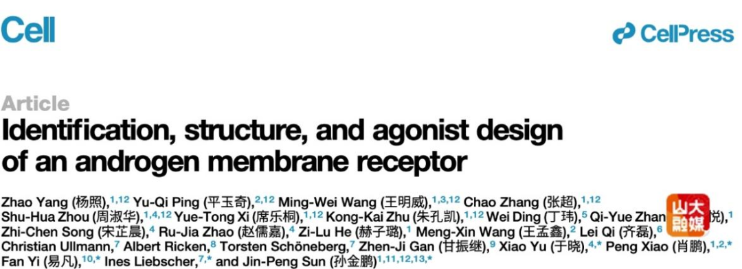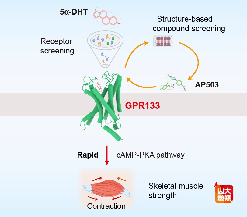 1月30日,山東大學(xué)基礎(chǔ)醫(yī)學(xué)院孫金鵬教授團隊,聯(lián)合德國萊比錫大學(xué)Ines Liebscher教授團隊,山東大學(xué)易凡教授團隊、肖鵬教授團隊和于曉教授團隊,在《細胞》(Cell)在線發(fā)表了研究論文“Identification, structure and agonist design of an androgen membrane receptor”。研究團隊篩選鑒定了雄激素5α-DHT的膜受體GPR133/ADGRD1,闡明了其在骨骼肌中的調(diào)控作用及分子機制,并發(fā)展了特異性GPR133的小分子配體,為高效安全的雄激素替代藥物開發(fā)提供了全新思路。