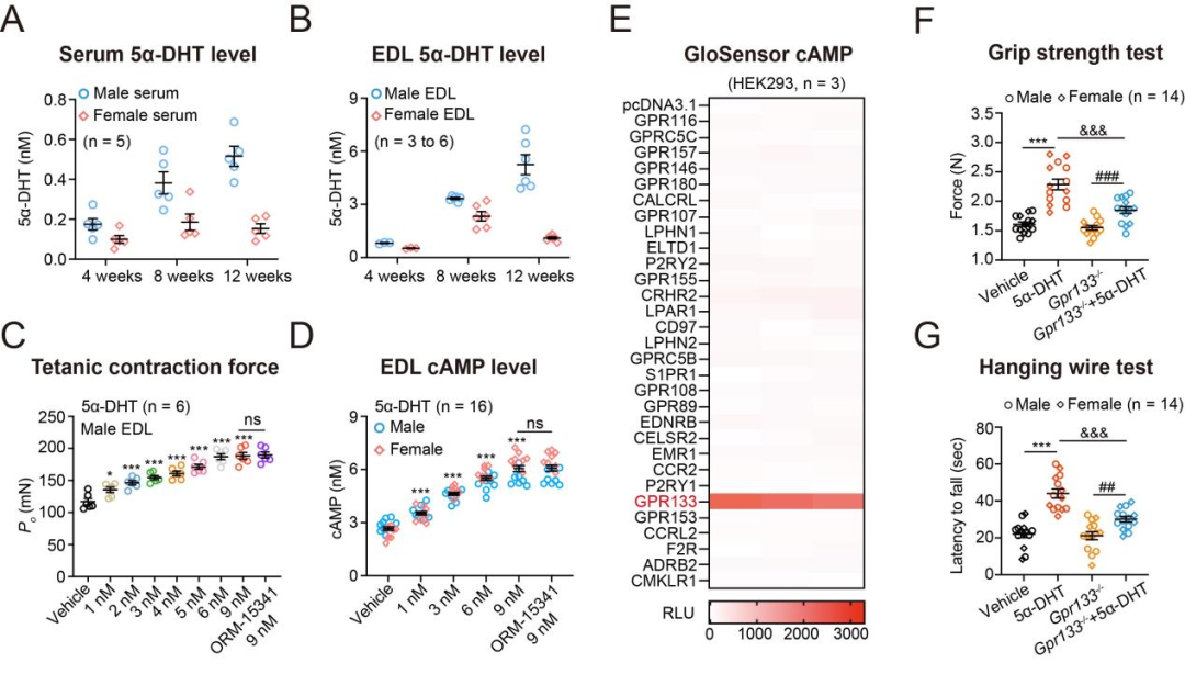 DHT是人體內(nèi)作用最強的雄激素,不僅決定性器官的發(fā)育和第二性征的形成(如體毛、聲音變化等),還廣泛參與人體能量代謝、免疫系統(tǒng)調(diào)節(jié)、大腦功能以及某些疾病(如腫瘤)的發(fā)生發(fā)展。研究發(fā)現(xiàn),DHT可能通過細胞膜上的某種特殊受體起作用。骨骼肌中的一種名為GPR133的蛋白質(zhì)是DHT的膜受體。當(dāng)這個受體被敲除后,小鼠對DHT增強肌肉收縮力的反應(yīng)顯著減弱。這表明,GPR133是DHT快速作用的重要開關(guān)。