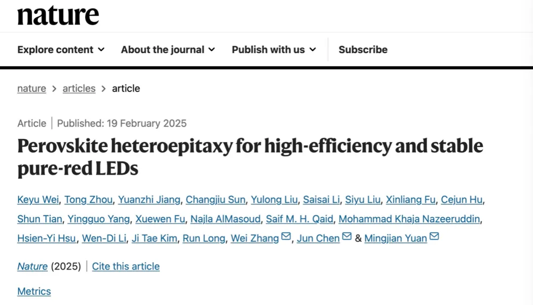 北京時間2月20日,國際權威學術期刊《自然》(Nature)在線發(fā)表南開大學化學學院教授袁明鑒、中國科學院院士陳軍、研究員章煒領銜的科研團隊在新型鈣鈦礦超高清顯示技術領域的最新研究進展。