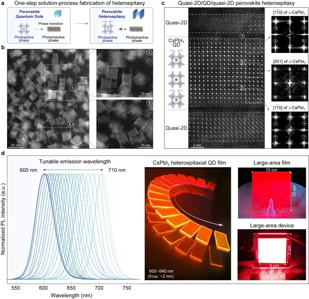 該研究題為“Perovskite heteroepitaxy for high-efficiency and stable pure-red LEDs”。團隊針對新型鈣鈦礦超高清顯示技術中純紅光CsPbI3鈣鈦礦量子點材料相穩(wěn)定性差這一世界難題,率先提出“外延異質結界面應力操控”策略,首次利用全溶液法實現(xiàn)鈣鈦礦范德華外延異質結的大面積原位可控制備,成功突破材料穩(wěn)定性與器件性能雙重瓶頸,研發(fā)出高效率與高穩(wěn)定性兼?zhèn)涞募兗t光鈣鈦礦電致發(fā)光器件 (LED),為下一代超高清顯示技術發(fā)展提供了關鍵技術支撐,標志著在該領域的重大技術突破。