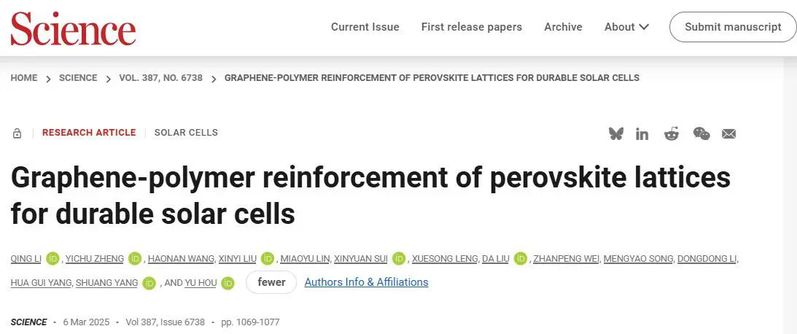 北京時間3月7日凌晨,華東理工大學材料學院清潔能源材料與器件團隊侯宇教授、楊雙教授等人在Science(《科學》)發(fā)表題為“Graphene-polymer reinforcement of perovskite lattices for durable solar cells”的最新研究成果。該研究發(fā)現(xiàn)了鈣鈦礦光伏不穩(wěn)定性的關鍵機制——光機械誘導分解效應,提出石墨烯-聚合物機械增強鈣鈦礦材料的新方法,制備的太陽能電池器件在標準太陽光照及高溫下的T97工作壽命創(chuàng)下3670小時新紀錄,該研究成果將為鈣鈦礦太陽電池的產(chǎn)業(yè)化應用提供全新解決方案。