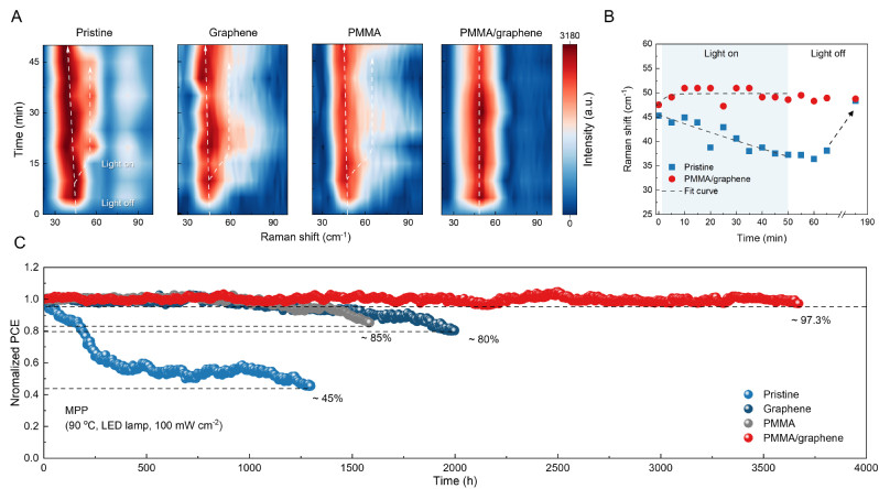 圖3. 石墨烯-聚合物耦合界面實現(xiàn)鈣鈦礦太陽能電池工況壽命的新突破