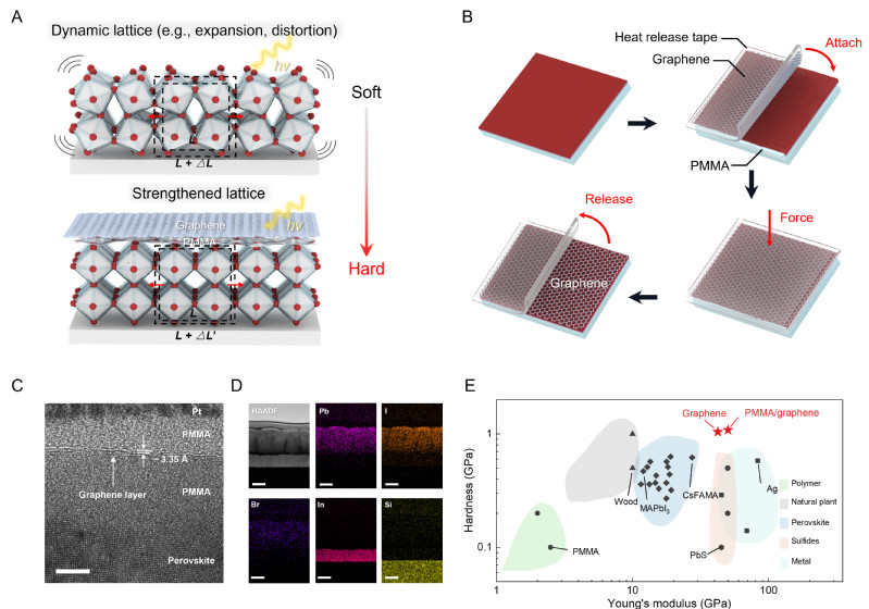 石墨烯具有超高模量(約1 TPa),是鈣鈦礦材料模量的50~100倍,且具有均勻致密、耐機械疲勞和化學穩(wěn)定的優(yōu)點。有沒有可能借用石墨烯這個“外援”,來提升鈣鈦礦的穩(wěn)定性呢?然而,石墨烯與鈣鈦礦并不兼容,如何實現(xiàn)是一大難題。
