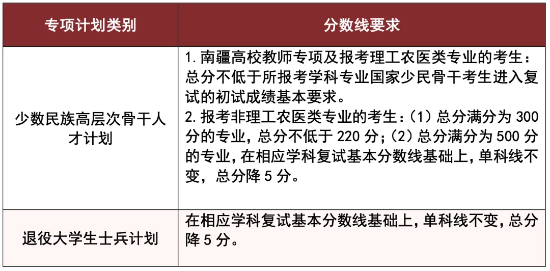 3.我校少數(shù)民族照顧政策按照教育部《2025年全國碩士研究生招生工作管理規(guī)定》執(zhí)行。工作單位在國務(wù)院公布的民族區(qū)域自治地方,且定向就業(yè)原單位的少數(shù)民族在職人員考生,申請享受照顧政策的,須在網(wǎng)上報名時按要求填報相關(guān)信息。未按規(guī)定申報或?qū)徍宋赐ㄟ^的,不享受照顧政策。學(xué)校將根據(jù)考生材料和有關(guān)部門反饋的名單進(jìn)行審核。審核通過者可在相應(yīng)普通計劃學(xué)科分?jǐn)?shù)線基礎(chǔ)上總分降5分或一門單科降5分,考生在享受照顧政策后,分?jǐn)?shù)不得低于享受少數(shù)民族照顧政策國家線有關(guān)要求。