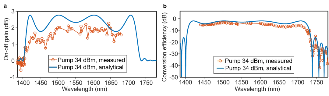 基于以上重大挑戰(zhàn),趙平團隊提出基于“脊形減模+彎曲濾?!奔夹g的單模、負色散非線性集成光波導設計普適性方法,原理上消除了過往參量放大非線性多模集成光波導中的隨機模式串擾。團隊以超低損耗非線性氮化硅集成平臺為例,制備出具有平坦傳輸光譜的、單模負色散非線性集成光波導芯片,如圖1所示。團隊還進一步發(fā)展了非線性氮化硅集成光波導中模電模式基模(TE00)二階與四階色散精確協(xié)同調(diào)控技術,實驗中實現(xiàn)了帶寬高達330nm的片上光參量放大,如圖2所示。該項研究為新一代超大帶寬光放大提供了新思路,在提升光纖/無線光通信容量,擴大數(shù)據(jù)中心光互連規(guī)模,提高光學測量精度,拓展光譜檢測分析范圍等方面有良好的應用潛力。