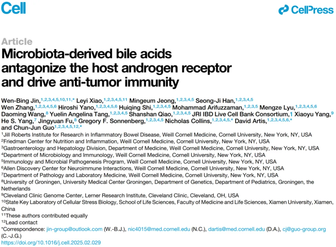 近日,廈門大學(xué)生命科學(xué)學(xué)院金文兵教授團隊在國際頂級期刊Cell上發(fā)表論文。該研究揭示了:腸道微生物產(chǎn)生的新型膽汁酸可以通過拮抗雄激素受體,從而調(diào)節(jié)腫瘤免疫!