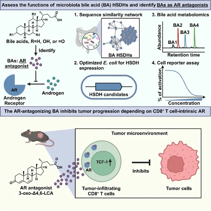 4月15日,金文兵教授團隊在Cell上在線發(fā)表題為Microbiota-derived bile acids antagonize the host androgen receptor and drive anti-tumor immunity的研究論文,該研究結(jié)合膽汁酸代謝組學(xué)與合成生物學(xué),對207種潛在的微生物膽汁酸羥類固醇脫氫酶(HSDH)進行了功能分析,成功鑒定出56種新型膽汁酸,并發(fā)現(xiàn)其中一類膽汁酸是有效的雄激素受體(AR)拮抗劑,能夠抑制與AR相關(guān)的基因表達,且具有明確的人體相關(guān)性,并進一步展示了其中一種膽汁酸以依賴于CD8+ T細胞中AR信號通路的機制抑制腫瘤的發(fā)生進展,同時增強免疫檢查點抑制劑(anti-PD-1)的治療效果。