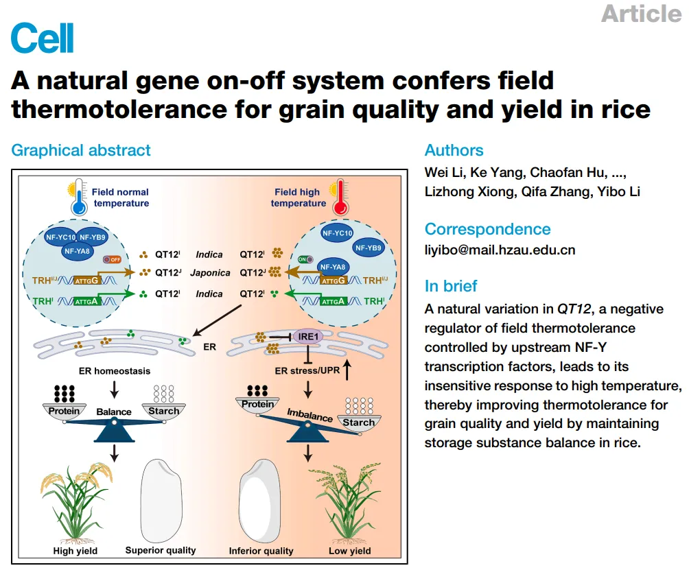 北京時間4月30日,國際期刊《細(xì)胞》(Cell)發(fā)表了華中農(nóng)業(yè)大學(xué)作物遺傳改良全國重點實驗室、生命科學(xué)技術(shù)學(xué)院、湖北洪山實驗室水稻團隊李一博教授課題組題為“一個天然的基因開關(guān)系統(tǒng)協(xié)同賦予水稻品質(zhì)和產(chǎn)量田間耐熱性”(A natural gene on-off system confers field thermotolerance for grain quality and yield in rice)的研究論文。