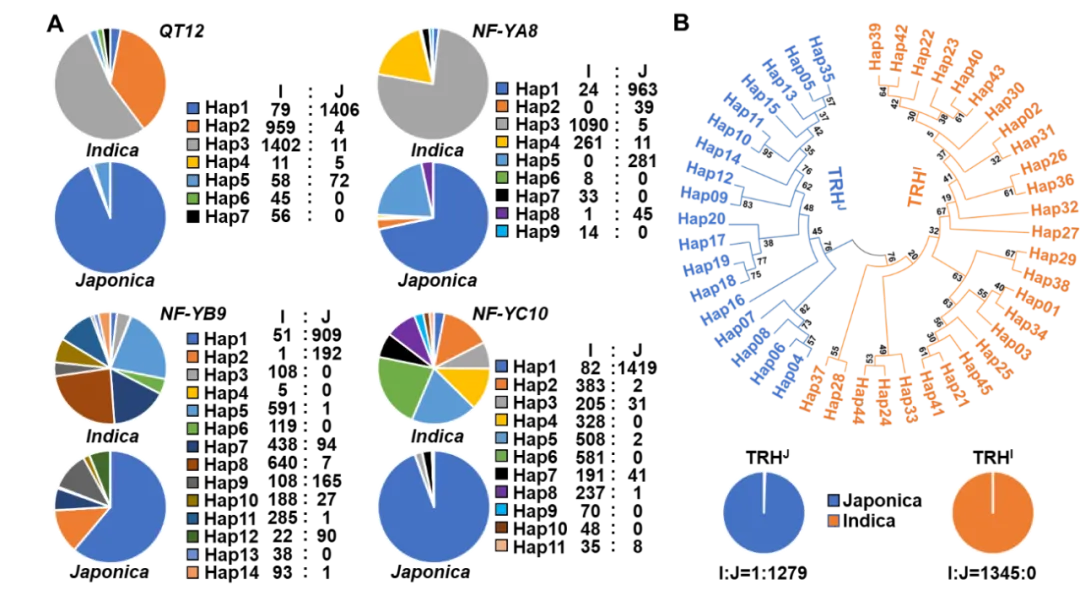 研究發(fā)現(xiàn),QT12基因及其上游調(diào)控因子NF-YA8、NF-YB9、NF-YC10均為秈粳分化基因,雖然它們位于不同染色體上,但在秈稻和粳稻中呈現(xiàn)顯著的協(xié)同分化或共選擇特征,進而形成了具有上位性效應(yīng)的不同單倍型組合。因此,研究團隊基于該NF-Ys-QT12基因開關(guān)系統(tǒng)的單倍型組合首次提出了性狀調(diào)控單倍型(TRHs)這一遺傳學(xué)新概念,該概念揭示了水稻秈稻與粳稻兩個亞種間耐熱性差異的分子基礎(chǔ)。