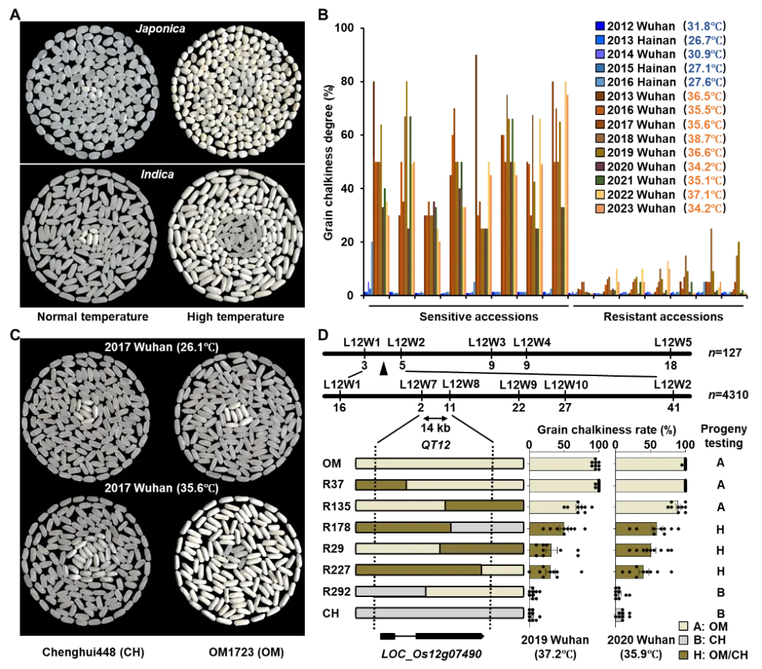 在這項研究中,經(jīng)過長達(dá)10余年的灌漿期田間自然高溫抗性種質(zhì)的大量篩選和鑒定,研究團隊利用自主研發(fā)的快速、高通量克隆作物重要農(nóng)藝性狀功能基因的RapMap方法(Zhang et al. NC, 2021),從大田耐熱水稻種質(zhì)中克隆到首個調(diào)控品質(zhì)耐高溫的主效QTL基因QT12,該基因同時表現(xiàn)出優(yōu)異的產(chǎn)量耐熱性。這一發(fā)現(xiàn)突破了傳統(tǒng)溫室篩選、苗期鑒定方法不能反映真實環(huán)境的局限,解決了長期困擾科學(xué)界的“耐高溫表型難鑒定、耐高溫基因難應(yīng)用”的瓶頸問題。