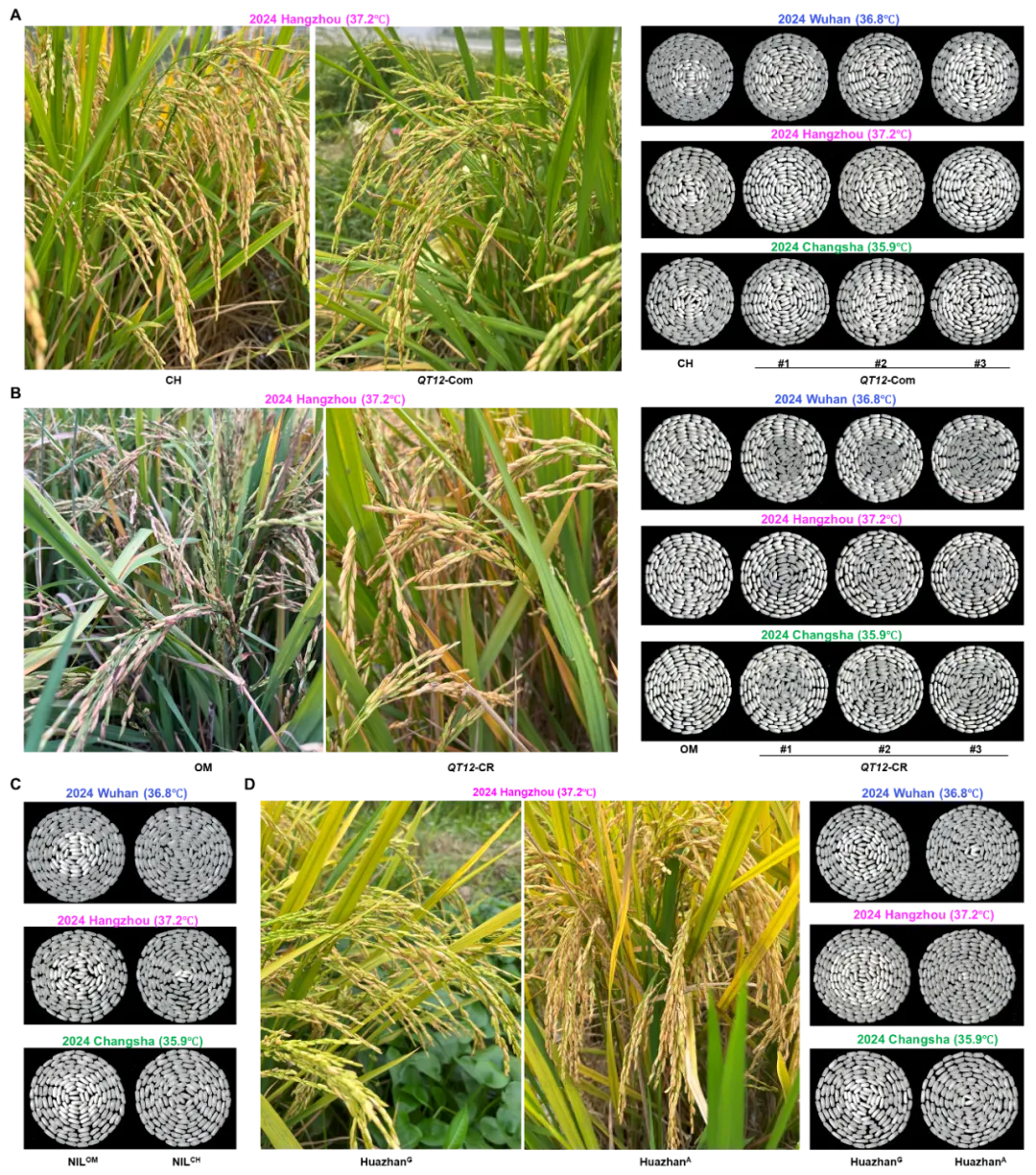 長江流域是我國第一大水稻主產(chǎn)區(qū),種植面積和年產(chǎn)量均約占全國總量的三分之二,然而近10年來該稻區(qū)極端高溫天氣頻發(fā),給水稻穩(wěn)產(chǎn)與優(yōu)質(zhì)帶來了嚴(yán)峻挑戰(zhàn)。然而,QT12基因的研究為這一難題帶來了突破性解決方案。通過2023和2024年武漢、杭州和長沙等長江流域極端高溫下的大規(guī)模田間試驗,低表達(dá)QT12基因在高溫環(huán)境下表現(xiàn)出很強的耐熱性:與野生型相比,CRISPR編輯的QT12基因突變株系在武漢、杭州和長沙的小區(qū)產(chǎn)量分別提升了92.5%、64.1%和54.7%,同時顯著降低了稻米堊白率和堊白度,提升了稻米外觀品質(zhì)和食味品質(zhì)。