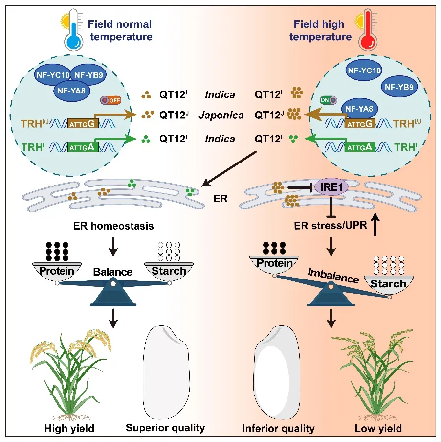 該研究首次揭示了水稻對抗高溫的秘密武器——基因QT12。它如同作物內(nèi)置天然“空調(diào)系統(tǒng)”,調(diào)節(jié)水稻耐高溫機制。當(dāng)高溫來襲,QT12自然變異與NF-Y蛋白復(fù)合體形成的初級-次級“雙生鎖”,鎖住高溫開關(guān)系統(tǒng),既平衡了儲藏蛋白與淀粉的合成穩(wěn)態(tài),又穩(wěn)定了稻米品質(zhì)和產(chǎn)量,為水稻在高溫環(huán)境下的同時實現(xiàn)優(yōu)質(zhì)高產(chǎn)提供了全新的分子機制和綠色發(fā)展的育種策略。