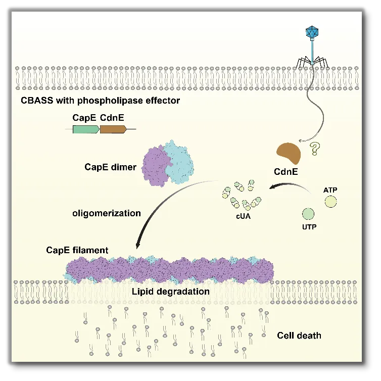 億萬(wàn)年的時(shí)間里,噬菌體與細(xì)菌之間不斷進(jìn)行著攻擊-防御-反擊的戰(zhàn)斗。為了阻止噬菌體入侵,細(xì)菌進(jìn)化出一系列復(fù)雜而精巧的抗噬菌體防御系統(tǒng),又被稱為“原核生物的免疫系統(tǒng)”。其中,基于環(huán)狀寡核苷酸的抗噬菌體信號(hào)傳導(dǎo)系統(tǒng)(CBASS,cyclic-oligonucleotide-based anti-phage signaling systems)備受關(guān)注。該系統(tǒng)在響應(yīng)噬菌體感染后被激活,通過合成環(huán)狀寡核苷酸第二信使分子,迅速放大信號(hào),進(jìn)而激活下游效應(yīng)蛋白,引發(fā)細(xì)胞殺傷作用,導(dǎo)致細(xì)菌在噬菌體復(fù)制完成前死亡,阻止了噬菌體的復(fù)制和擴(kuò)散。