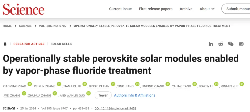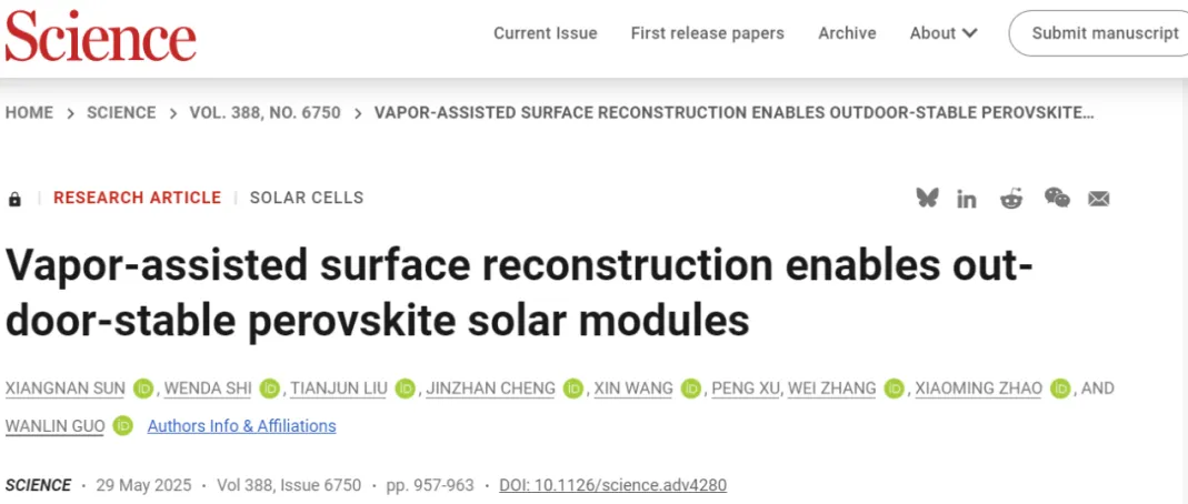南京航空航天大學(xué)國際前沿科學(xué)研究院郭萬林教授和趙曉明教授團(tuán)隊繼2024年7月開發(fā)氣相氟化技術(shù)實現(xiàn)大面積鈣鈦礦太陽能電池的均勻穩(wěn)定化后,于2025年5月30日再次在《Science》發(fā)表最新成果“Vapor-assisted surface reconstruction enables outdoor-stable perovskite solar modules”,開發(fā)了更綠色、更具經(jīng)濟(jì)性的氣相輔助表面重構(gòu)技術(shù),抑制了產(chǎn)業(yè)級鈣鈦礦模組在戶外環(huán)境下的不可逆退化,在30 cm × 30 cm鈣鈦礦模組中首次實現(xiàn)與商用晶硅太陽能電池相當(dāng)?shù)膽敉膺\行穩(wěn)定性。