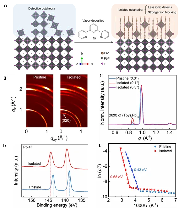 針對上述問題,團(tuán)隊開發(fā)出更綠色、更具經(jīng)濟(jì)性的“氣相輔助表面重構(gòu)”技術(shù),相較于前代氣相氟化技術(shù),新方法無需專用設(shè)備,僅通過氣相沉積多齒配體即可實現(xiàn)鈣鈦礦表面結(jié)構(gòu)的原位重構(gòu),隔離缺陷富集的表面單元,實現(xiàn)離子不可逆遷移的抑制。這項創(chuàng)新技術(shù)不僅闡明了不可逆離子遷移是導(dǎo)致器件性能永久衰退的本質(zhì)原因,更通過抑制該過程首次在鈣鈦礦電池上實現(xiàn)了與硅太陽能電池比肩的戶外穩(wěn)定性,同時工藝成本較前代技術(shù)大幅下降,且完全兼容現(xiàn)有光伏產(chǎn)線設(shè)備體系,為鈣鈦礦光伏技術(shù)的規(guī)?;瘧?yīng)用掃清了關(guān)鍵障礙,標(biāo)志著該領(lǐng)域從實驗室創(chuàng)新向產(chǎn)業(yè)化落地邁出了里程碑式的一步。