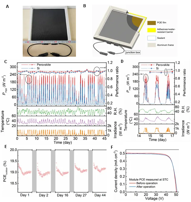 為了進(jìn)一步考察鈣鈦礦模組的戶外穩(wěn)定性,在高溫高濕的夏季將鈣鈦礦模組和商用晶硅太陽能電池一起對比,發(fā)現(xiàn)產(chǎn)業(yè)級鈣鈦礦模組展示出與商用晶硅太陽能電池相當(dāng)?shù)姆€(wěn)定性。并且由于鈣鈦礦電池較低的溫度系數(shù),其在高溫條件下的功率保持率甚至優(yōu)于晶硅太陽能電池,證明了鈣鈦礦太陽能電池實際應(yīng)用的可能性。