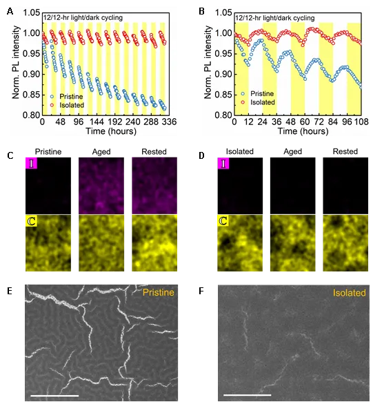 于是,帶著進(jìn)一步優(yōu)化技術(shù)方案的目的,團(tuán)隊進(jìn)行了深入的研究,并在戶外實測中觀察到了一個獨特現(xiàn)象:鈣鈦礦模組在晝夜循環(huán)中呈現(xiàn)出有趣的“可逆衰減”行為,即模組在白天工作時會出現(xiàn)性能衰退,但經(jīng)過夜晚的“休息”又能恢復(fù)部分性能。繼續(xù)研究發(fā)現(xiàn),這種特殊行為與鈣鈦礦薄膜中碘離子的可逆/不可逆遷移行為密切相關(guān)——可逆遷移發(fā)生在鈣鈦礦層內(nèi),所引起的性能衰減具有夜間自修復(fù)特性,而不可逆遷移涉及離子向電荷傳輸層或電極的逃逸,將導(dǎo)致器件性能的永久性衰退。