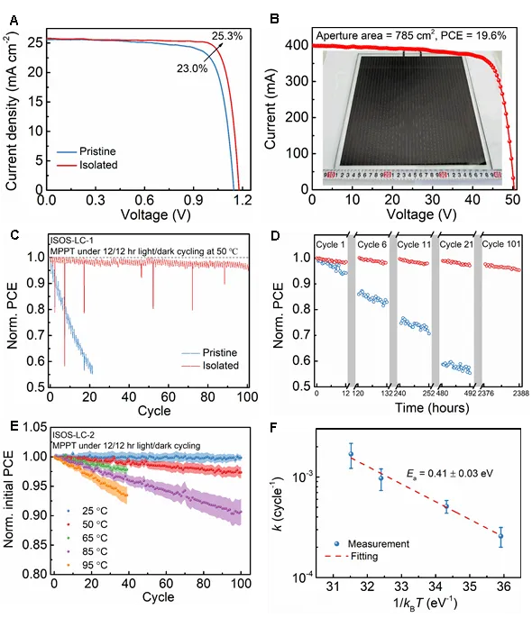 經(jīng)過氣相輔助表面重構(gòu)的太陽能電池實現(xiàn)了更高的光電轉(zhuǎn)換效率和穩(wěn)定性。0.16cm2單元電池和785cm2太陽能模組的PCE分別為25.3%和19.6%。光/暗循環(huán)加速老化測試結(jié)果表明,模組的預(yù)計T80壽命(效率下降至初始效率的80%所需的時間)達(dá)到2478次循環(huán)(等效于25℃環(huán)境下循環(huán)運行超過6.7年),為報道中最具穩(wěn)定性的鈣鈦礦模組。