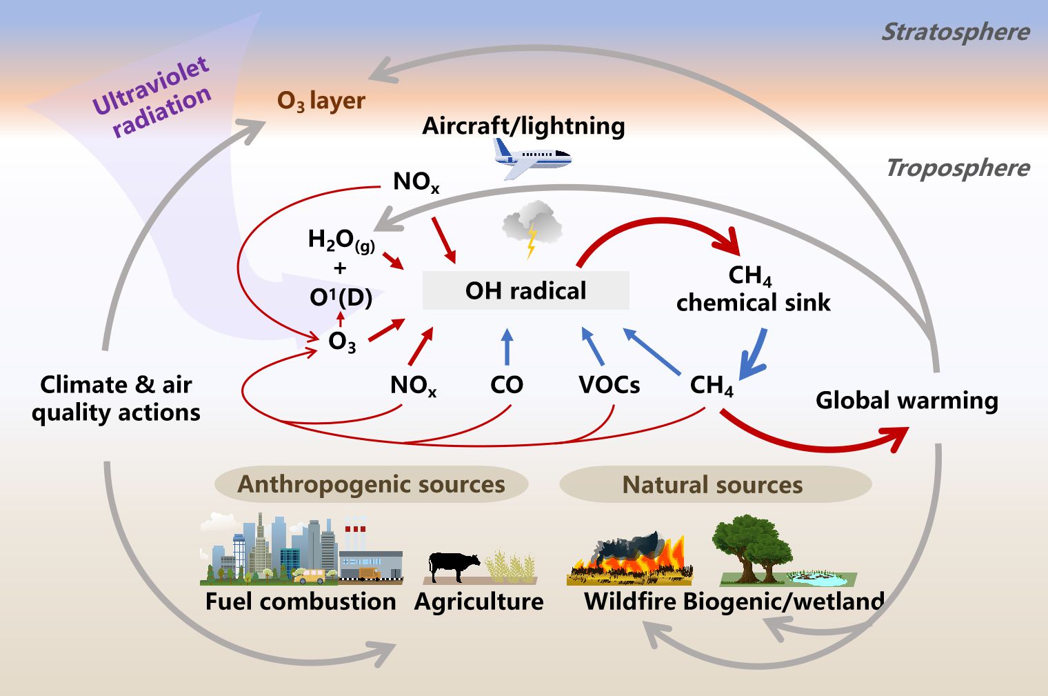 圖2.全球空氣污染與OH自由基、甲烷源匯收支之間的復(fù)雜相互作用