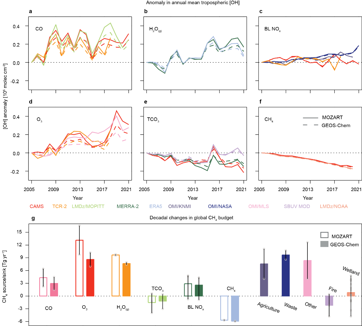 圖1.OH自由基前體物驅(qū)動(dòng)的全球?qū)α鲗覱H自由基濃度和甲烷匯的變化
