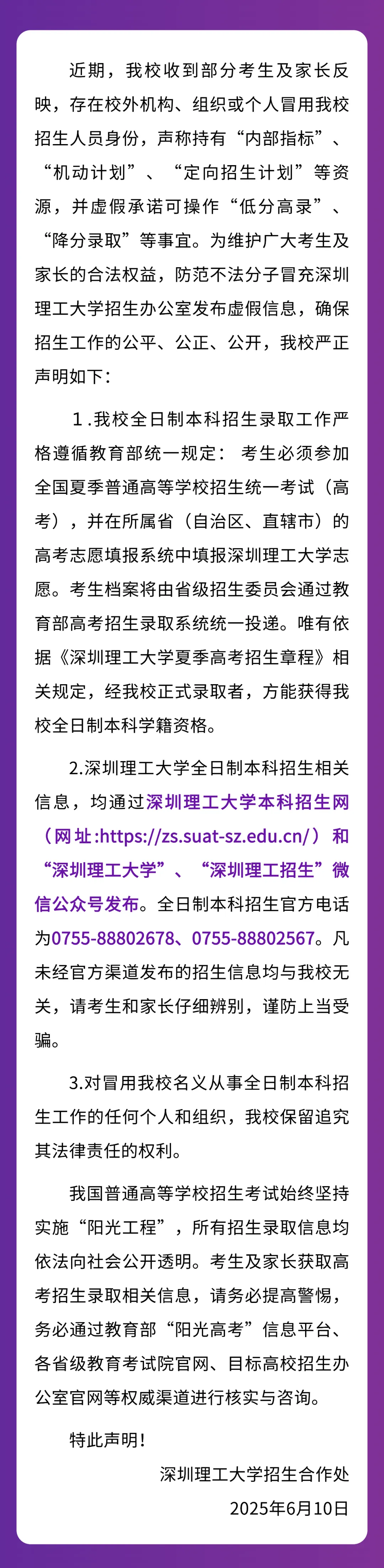 6月10日,深圳理工大學(xué)發(fā)布聲明稱(chēng),近期,學(xué)校收到部分考生及家長(zhǎng)反映,有校外機(jī)構(gòu)、組織或個(gè)人冒用該校招生人員身份,聲稱(chēng)持有“內(nèi)部指標(biāo)”、“機(jī)動(dòng)計(jì)劃”、“定向招生計(jì)劃”等資源,并虛假承諾可操作“低分高錄”、“降分錄取”等事宜。為此深圳理工大學(xué)做出嚴(yán)正聲明:考生必須參加全國(guó)統(tǒng)一高考,并在高考志愿填報(bào)系統(tǒng)中填報(bào)深圳理工大學(xué)志愿,經(jīng)學(xué)校正式錄取者,方能獲得深圳理工大學(xué)全日制本科學(xué)籍資格。