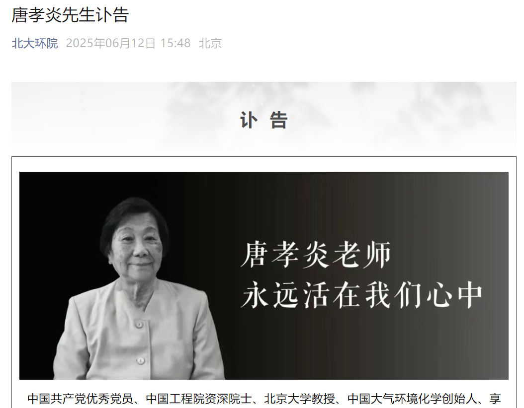 6月12日,北京大學(xué)環(huán)境科學(xué)與工程學(xué)院公眾號(hào)發(fā)布訃告:中國(guó)共產(chǎn)黨優(yōu)秀黨員、中國(guó)工程院資深院士、北京大學(xué)教授、中國(guó)大氣環(huán)境化學(xué)創(chuàng)始人、享有國(guó)際盛譽(yù)的環(huán)境科學(xué)家與大氣化學(xué)家唐孝炎先生因病醫(yī)治無效,于2025年6月11日16時(shí)在北京逝世,享年93歲。