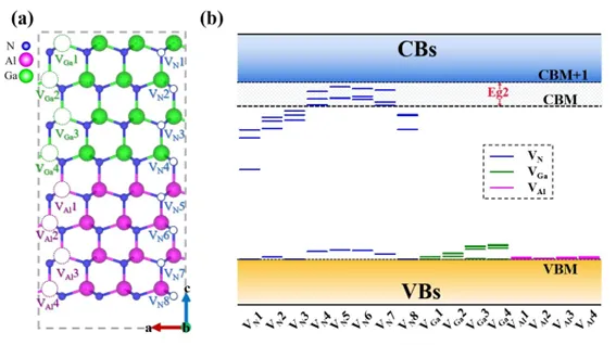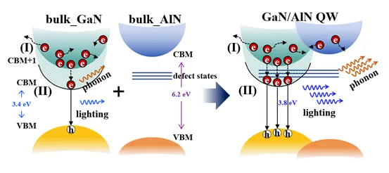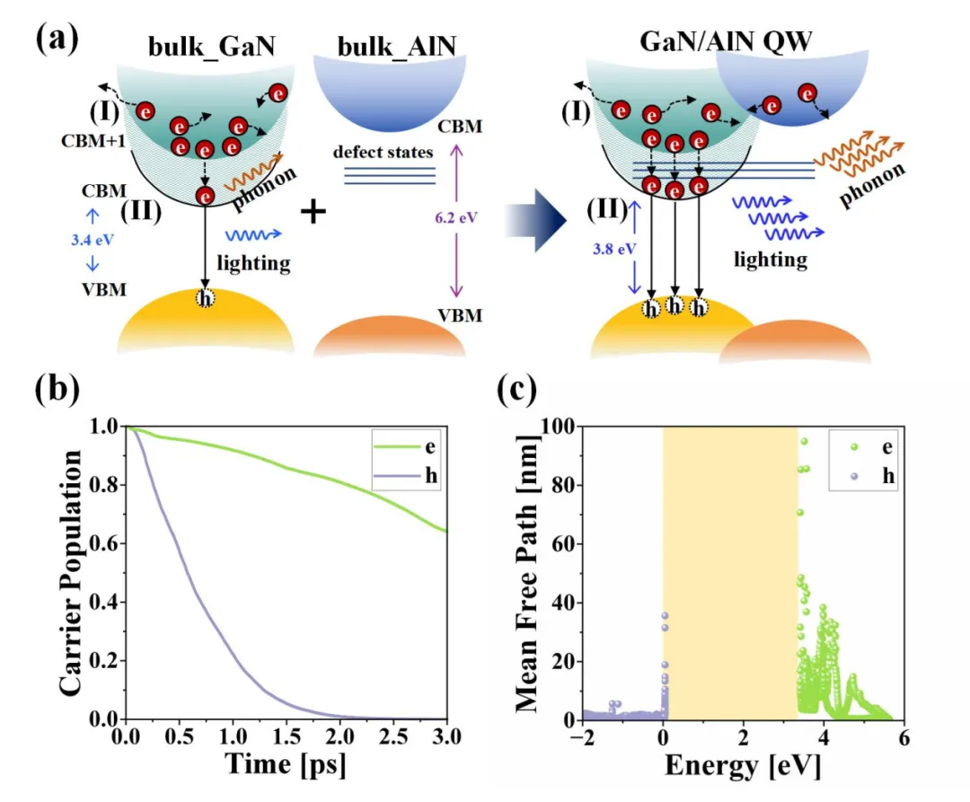 魏蘇淮教授和石芝銘、孫曉娟、黎大兵研究員團隊基于對氮化物能帶結(jié)構(gòu)和載流子動力學(xué)的分析,首次提出通過調(diào)控GaN/AlN量子阱界面的氮空位缺陷,實現(xiàn)對電子冷卻速率的有效增強。這些缺陷狀態(tài)作為中間能級,能夠顯著加強電子-聲子相互作用,從而加速電子向?qū)У桌鋮s。第一性原理計算表明,該策略可使電子冷卻時間縮短超過一個數(shù)量級,有效實現(xiàn)與空穴冷卻速率的動態(tài)平衡,大幅提升發(fā)光效率。與傳統(tǒng)EBL結(jié)構(gòu)相比,該方法無需額外結(jié)構(gòu)設(shè)計,即可實現(xiàn)電子動力學(xué)的精準(zhǔn)調(diào)控。該研究還進一步拓展了半導(dǎo)體缺陷物理的研究邊界,系統(tǒng)驗證了缺陷在調(diào)控器件性能方面的“有益性”作用,顛覆了缺陷是有害的傳統(tǒng)認知,為新一代電子與光電子器件的缺陷工程設(shè)計提供了理論支撐和新思路。
