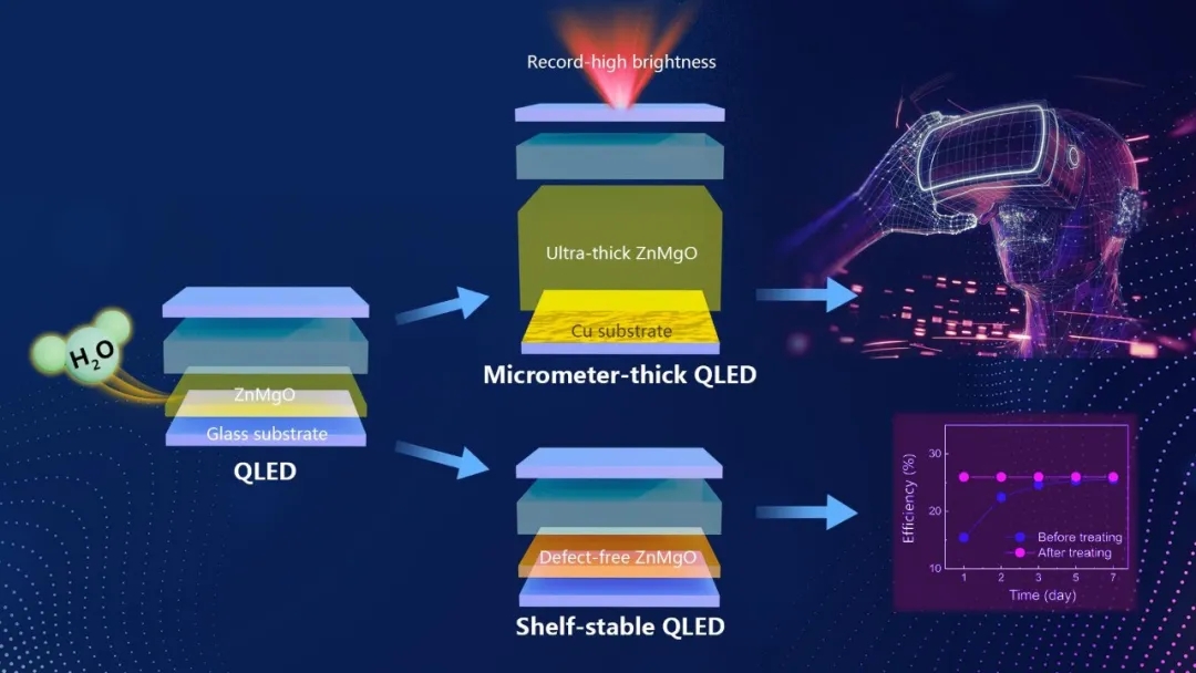 研究提出了水處理ZnMgO電子輸運層的新方法,有效鈍化了ZnMgO的缺陷,并顯著提高了ZnMgO的導(dǎo)電性,實現(xiàn)了微米級厚度及發(fā)光穩(wěn)定的高性能QLED。