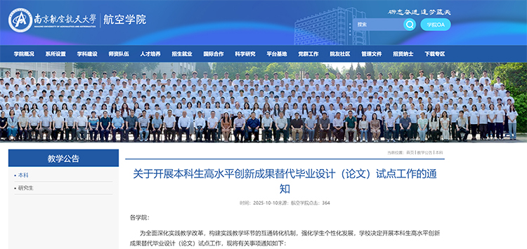 近日,南京航空航天大學發(fā)布《關于開展本科生高水平創(chuàng)新成果替代畢業(yè)設計(論文)試點工作的通知》,明確2026屆本科畢業(yè)生可申請用高水平競賽獲獎、創(chuàng)新實踐項目結題、學術論文發(fā)表、發(fā)明專利授權四類成果,替代畢業(yè)設計(論文)。